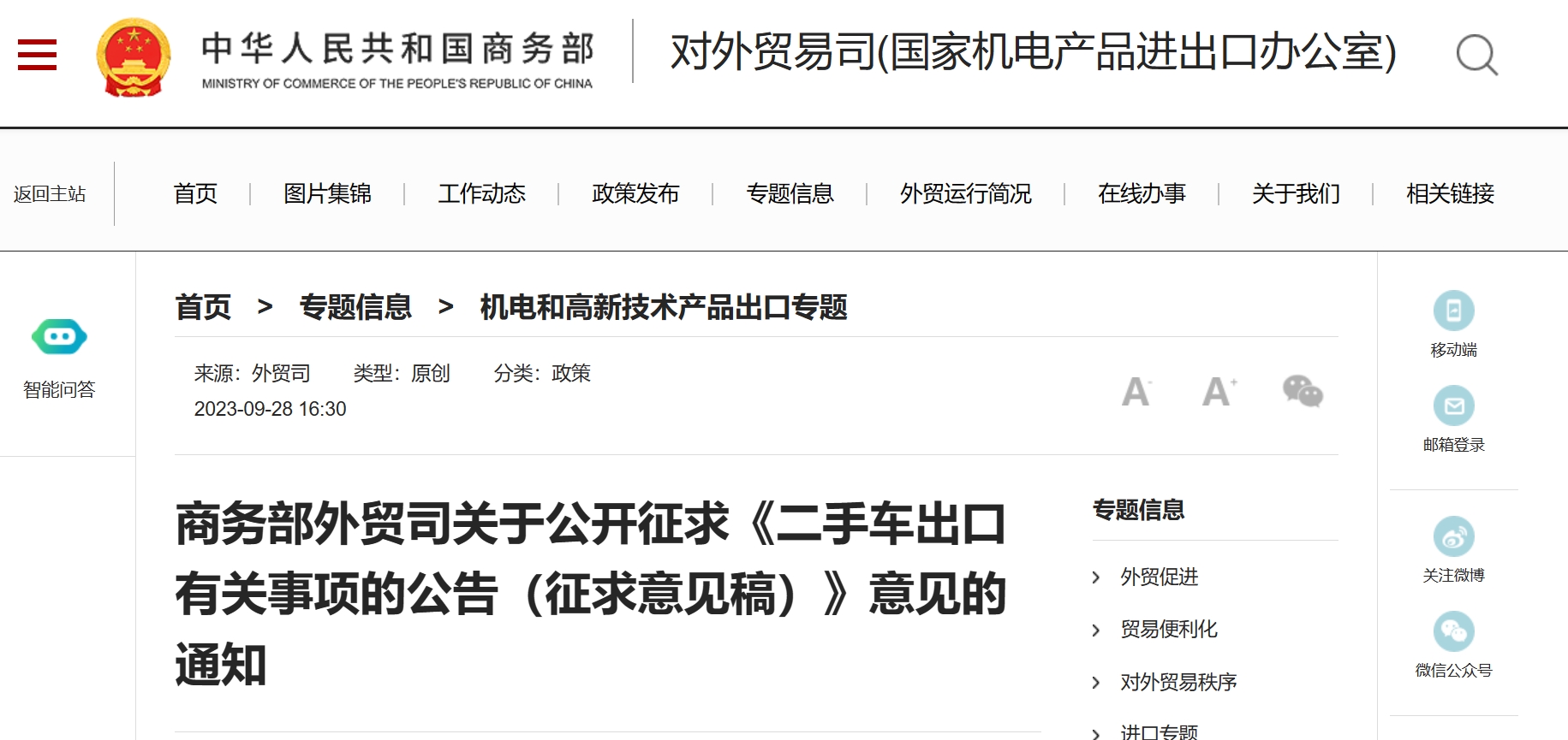 商務(wù)部外貿(mào)司關(guān)于公開征求《二手車出口有關(guān)事項(xiàng)的公告(征求意見稿)》意見的通知