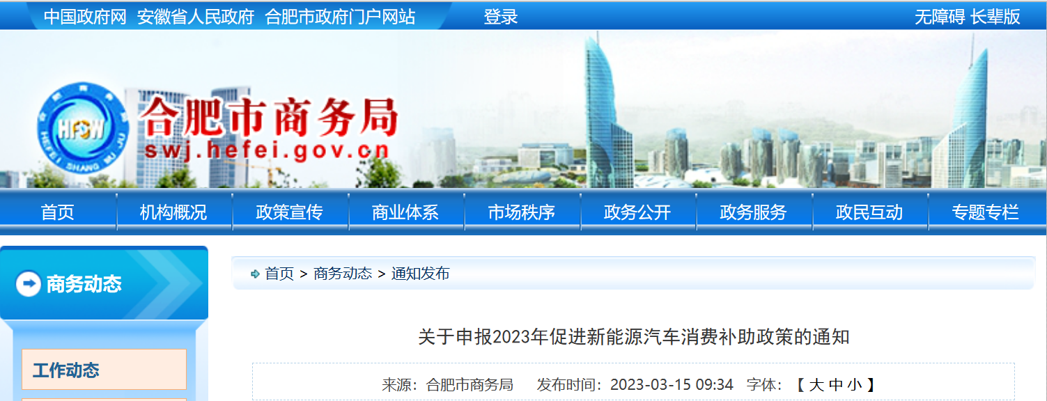 安徽省合肥市商務局關于申報2023年促進新能源汽車消費補助政策的通知為貫徹落實2023年《合肥市人民政府辦公室關于印發(fā)合肥市“提信心拼經濟”若干政策措施的通知》...
